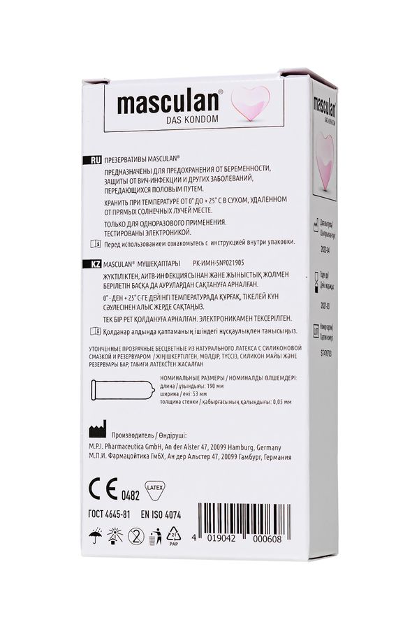 Masculan Pure – супер тонкие презервативы, поднимающие уровень естественных ощущений на максимум. Латексная стенка на 20% тоньше, чем у классических, и не влияет на эффективность защиты, сохраняя прочность, плотность и непроницаемость презерватива для инфекций. Дополнительное количество смазки повышает комфорт полового акта. Нежная поверхность воссоздает естественные ощущения кожи, увеличивая наслаждение обоих партнеров. Masculan – это презервативы премиум-класса, разработанные в Германии с соблюдением высочайших стандартов качества и дизайна. Немецкое производство, высококачественное сырье, и электронное 6-ти ступенчатое тестирование каждого презерватива обеспечивают безопасность и надежность. “Невидимые” тонкие презервативы с розовым оттенком. Приятный легкий аромат. 100% натуральный каучуковый латекс. Цилиндрическая форма с накопителем. Гипоаллергенная силиконовая смазка премиум-качества. Размер: длина 18,5 см, диаметр 5,3 см, толщина стенки – 0,05 мм.
