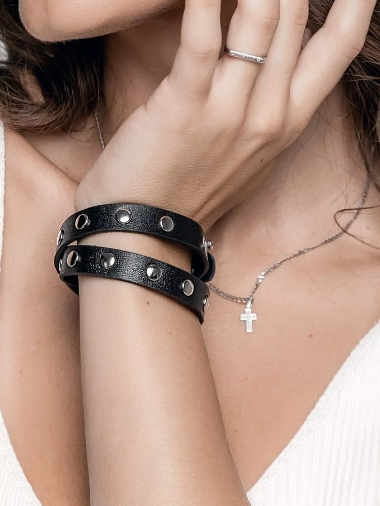 Браслет женский на руку кожаный узкий в два оборота, украшен никелированными клепками по всей длине. Регулируется с помощью конопок. Размер: ширина 1,2 см, длина 40 см. Браслет изготовлен из натуральной кожи. Цвет черный.