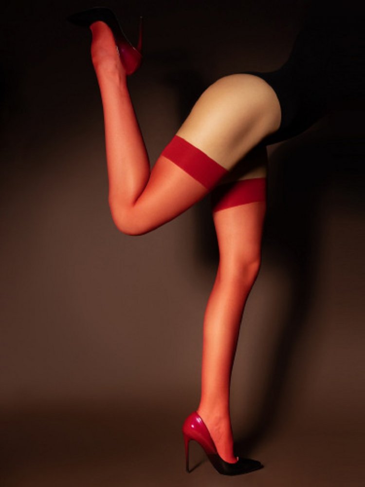 Красные матовые капроновые чулки под пояс – тот элемент одежды, который должен быть у каждой женщины. Главными отличительными особенностями этой модели являются их длина и обхват. На модели они надеты выше середины бедра, но, вы должны знать, что их можно расположить еще выше, при росте 175 см они свободно могут доходить до ягодиц и не пережимать ногу. Благодаря особому плетению затемненные полосочки, если они появятся, можно убрать, поочередно потянув материал сначала по горизонтали, а потом по вертикали несколько раз. Так же стоит заметить, что чулки имеют анатомический рельеф, а значит сидеть на ноге они будут идеально по определению. Размер 4/5(L/XL).