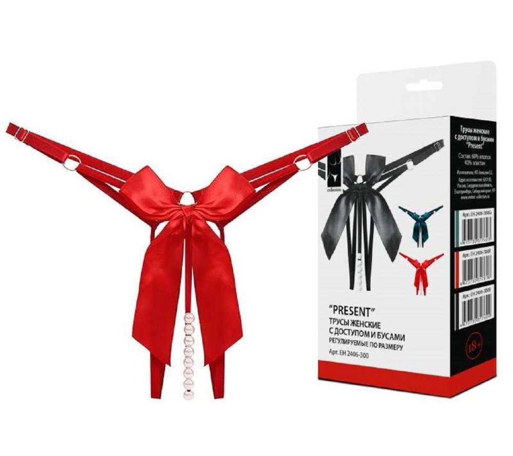 Описание Трусики Present из узких лент и небольших бусин разбудят желание и добавят нотку игривости в ваши отношения. Украшены сзади красным бантиком. По бокам имеют регулировку из пряжек. Диаметр бусин 1 см. Состав: 90% полиамид, 10% эластан.  Цвет красный. Размер: 42-46.