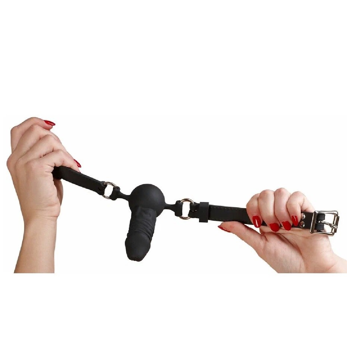 Кляп страпон с кожаным ремешком черного цвета. Сам кляп шарик с фалосом изготовлен из силикона, приятного на ощупь. Ремешки из натуральной кожи декорированы лаковой вставкой с пряжкой позволяют подогнать изделие по желаемому размеру. Размер: длина 54 см, ширина ремешка 2,5 см, диаметр шара 3,8 см, рабочая длина фалоса 6,5 см, диаметр 2,5 см. Цвет черный.