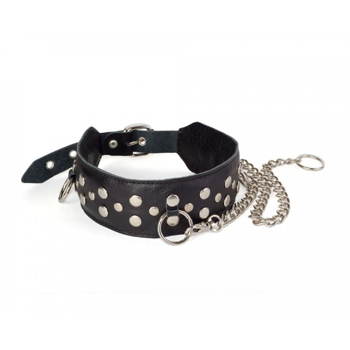 Чёрный ошейник из натуральной кожи, ширина которого составляет 4,5 см, имеет внутреннюю велюровую подкладку. Декоративным элементом данного аксессуара, является клёпки и три металлических кольца, удерживаемое кожаными накладками с клепками, кольца могут использоваться для присоединения поводка-цепочки к ошейнику. Длина поводка-цепочки с карабином 50 см. Фурнитутура имеет никелевое покрытие. Размер изделия регулируется металлической пряжкой.Размер: общая длина ошейника 50 см, ширина 4,5 см. Цвет черный.