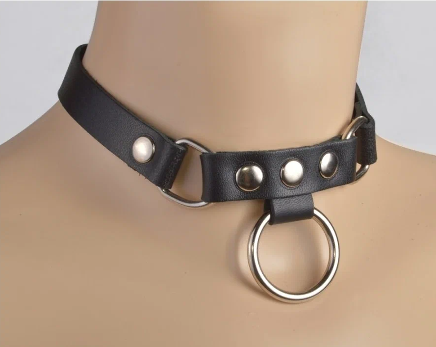 Стильный чокер изготовлен из натуральной кожи черного цвета с тремя клепками и декорирован металлическим кольцом. Вся металлическая фурнитура имеет никелевое покрытие. Регулируется при помощи кнопок. Размер: длина чокера 40 см, ширина 1,5 см.Цвет: черный.