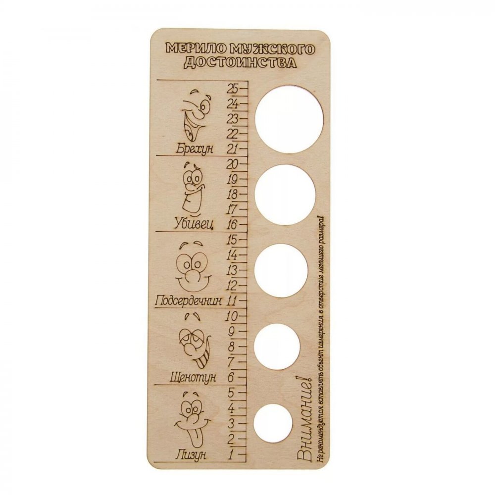 Мерило мужского достоинтсва - сувенирная линейка для веселой компании. Материал дерово. Внимание! Не рекомендуется вставлять объект измеренияв отверстие меньшего размера!