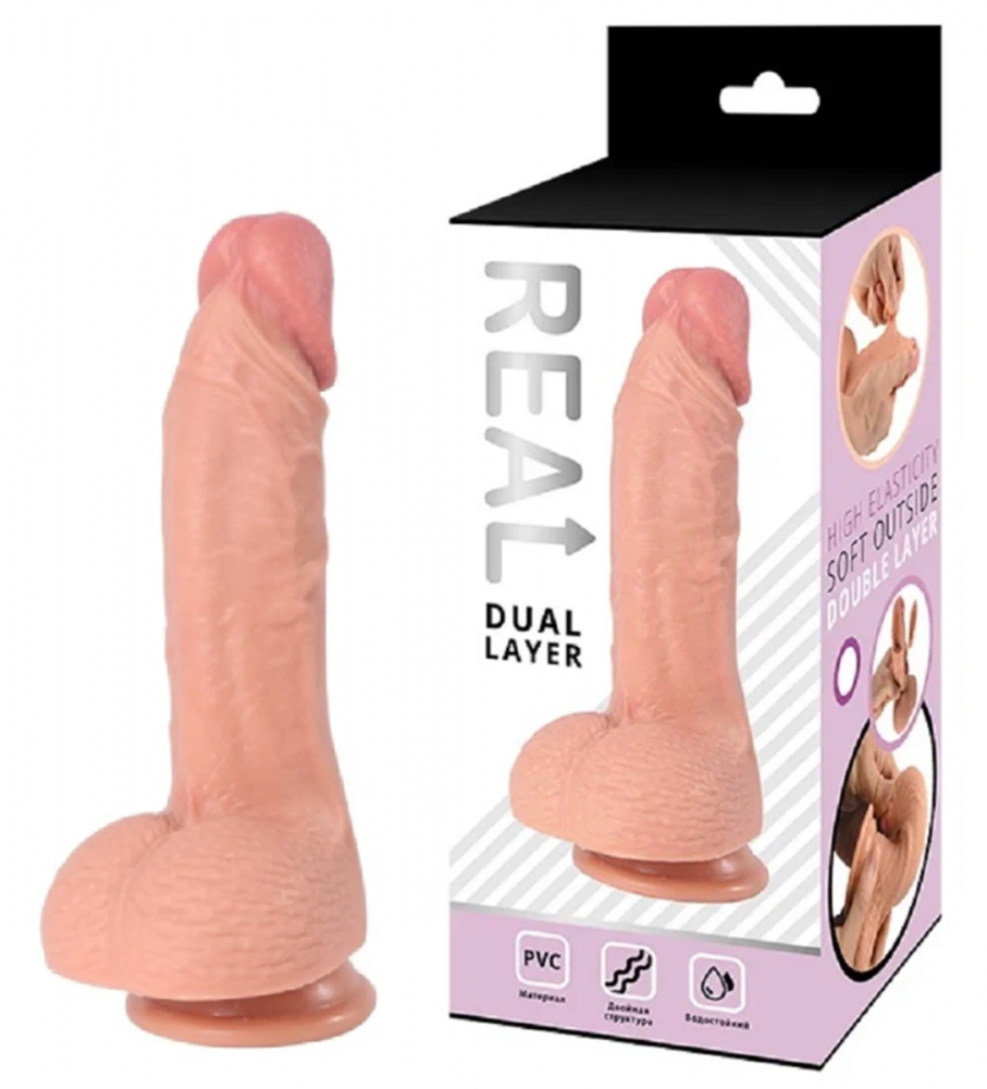 Real Dual Layer - реалистичный фаллоимитатор из высококачественного безопасного материала. Современная технология изготовления обеспечивает игрушке двойную структуру. Плотный стержень покрыт слоем нежного и приятного на ощупь материала. Такая структура материала позволяет добиться ощущения живой кожи, сохранив при этом гигиеничность и износостойкость силикона. Имитация имеет мягкую округлую головку, гибкое покрытое венками тело, упругую естественной формы мошонку. Присоска в основании позволяет надежно закрепить игрушку на любой гладкой поверхности или использовать в качестве страпона. Размер: общая длина 21 см, глубина проникновения 16 см, диаметр 4,6 см. Для более комфортного использования рекомендуем приобрести смазку на водной основе и очищающий спрей Clear Toy 100 мл для обработки изделия.