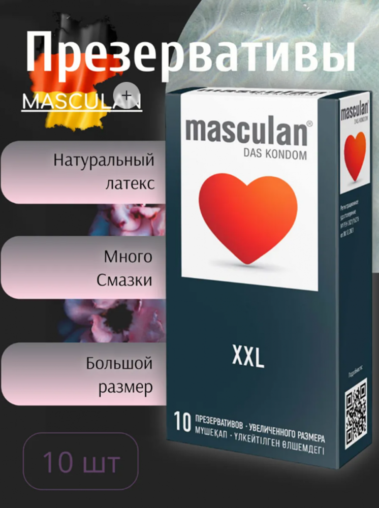 Masculan знает, что костюм должен сидеть по фигуре, поэтому специально для крупных мужчин созданы презервативы XXL, чтобы ничего не жало и не давило. Классические презервативы увеличенного размера сделают сексуальное приключение комфортным и безопасным. Иногда размер имеет значение, а правильно подобранный размер – залог безопасности. Чтобы ничто не отвлекало от самых прекрасных моментов любви, выбирайте Masculan. Masculan – это презервативы премиум-класса, разработанные в Германии с соблюдением высочайших стандартов качества и дизайна. Немецкое производство, высококачественное сырье, и электронное 6-ти ступенчатое тестирование каждого презерватива обеспечивают безопасность и надежность. Размер: длина 20 см, диаметр 5,5 см, толщина стенки 0,05 мм. В упаковке 10 шт.