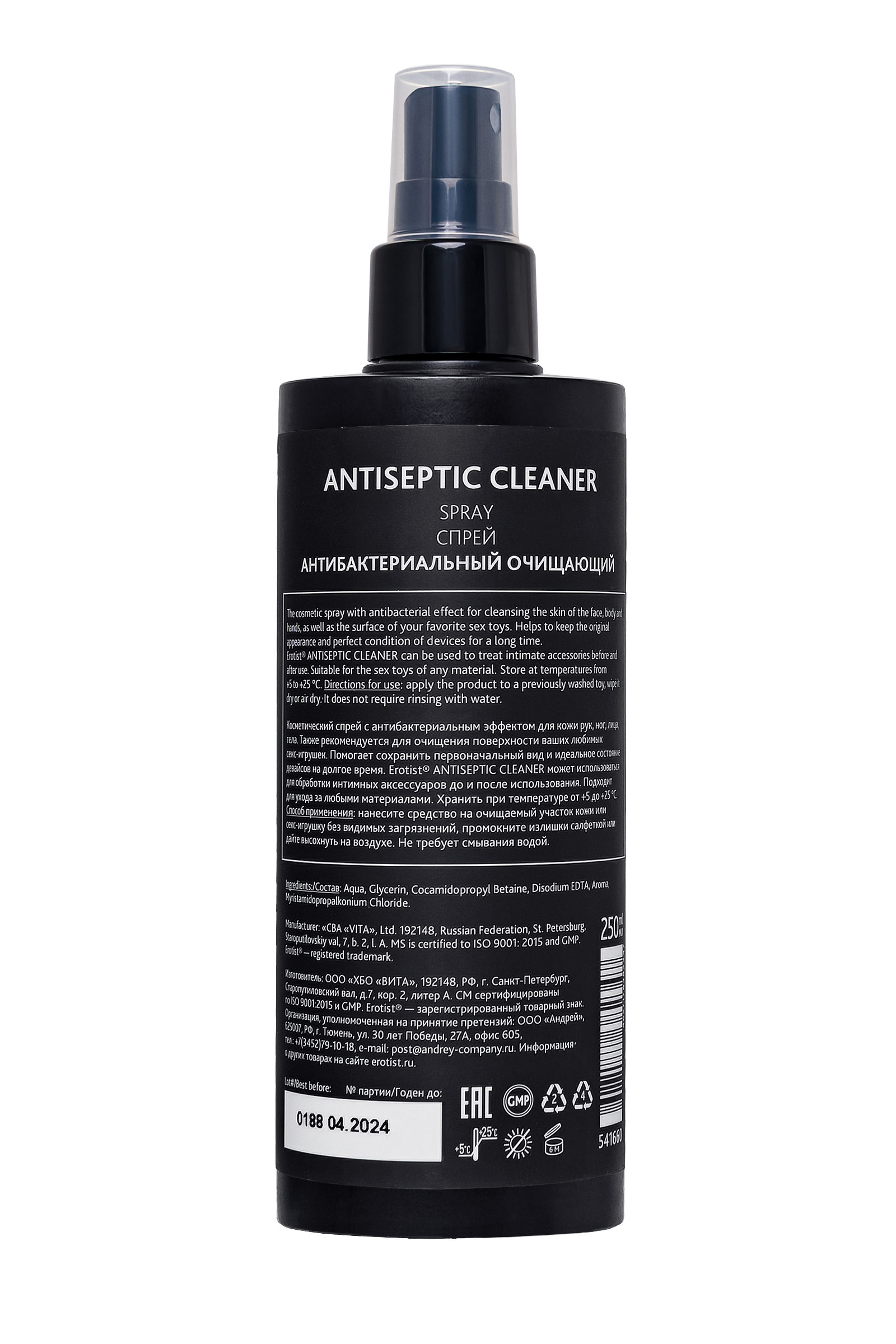 Антибактериальный очищающий спрей подходит для различных сфер жизни. Рекомендуется к использованию для очищения поверхности секс-игрушек. Он помогает сохранить первоначальный вид и идеальное состояние девайсов на долгое время. Подходит для ухода за игрушками из любого материала до и после их использования. Также его можно использовать как средство для кожи с антибактериальным эффектом. Для наилучшего эффекта помойте игрушку водой, а затем нанесите Anticeptic Cleaner от Erotist®. Промокните излишки салфеткой или дайте высохнуть на воздухе. Для антибактериальной защиты кожи нанесите на очищаемый участок и равномерно распределите. Объем: 250 мл.