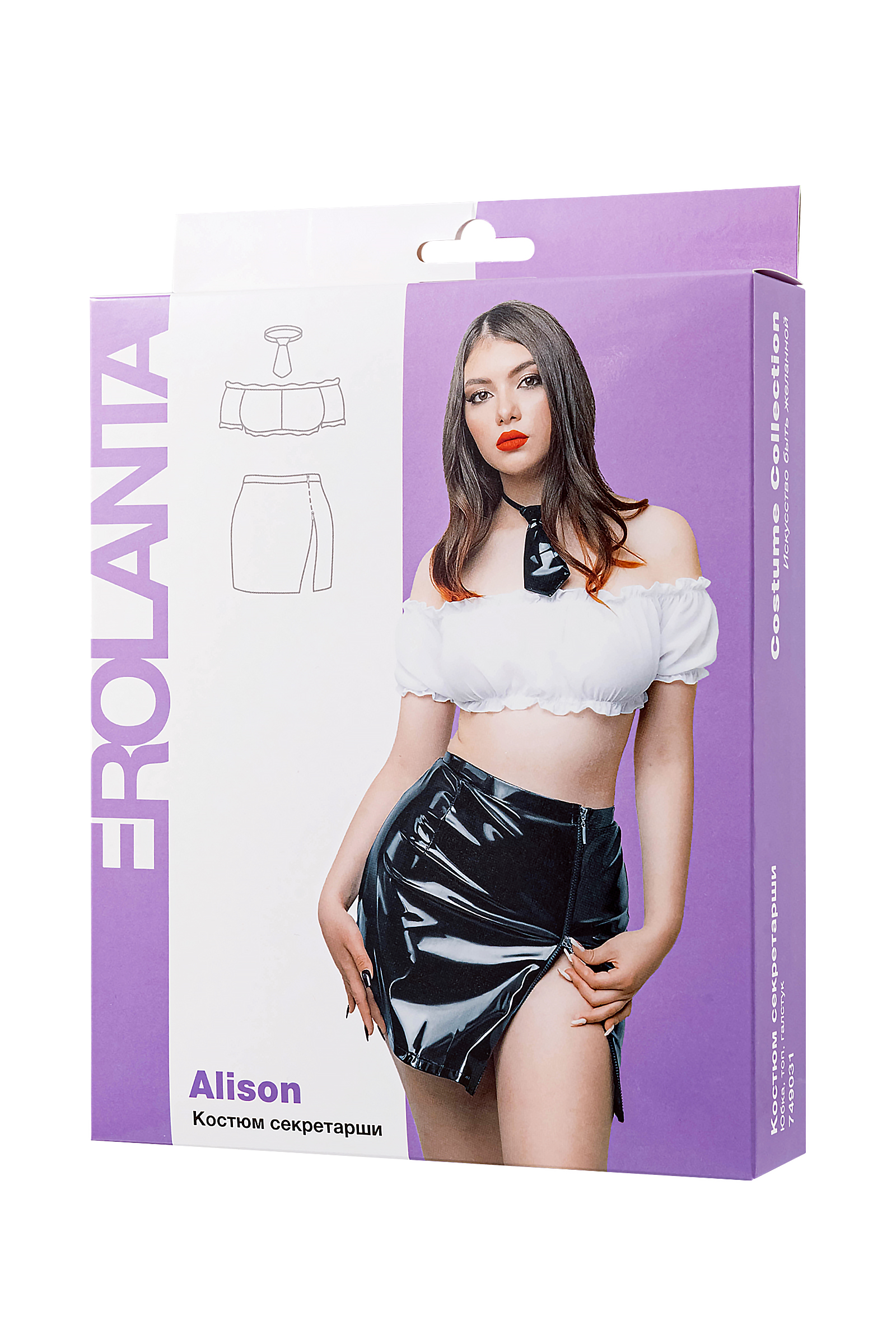 Соблазнительный костюм секретарши Erolanta Alison выполнен в классической черно-белой гамме и включает в себя: мини-юбку, укороченный топ и игривый галстучек. Прямая юбка из трикотажной лаковой кожи скрывает животик, даёт небольшую коррекцию силуэта, подчеркивает талию и бедра. Двусторонняя молния спереди визуально удлиняет ноги и добавляет элемент игры - скинуть юбку можно в одно мгновение. Невесомый прозрачный топ из шифона придает груди соблазнительный объем, подчеркивает ключицы и декольте, не сковывает движений. Рукава-фонарики дают возможность прикрыть плечи или наоборот - добавить образу обнаженности. Галстук на эластичной резинке с небольшим крючком сзади завершает образ и придаёт кокетства. Состав: блузка 100% полиэстер, юбка и галстук 60% полиуретан, 40% полиэстер. Размер: 42-44. Цвет: черный с белым.