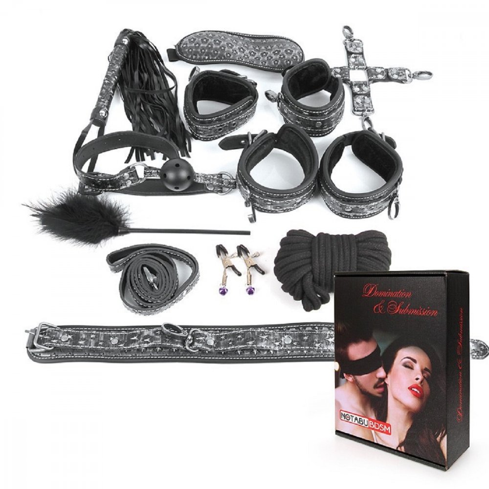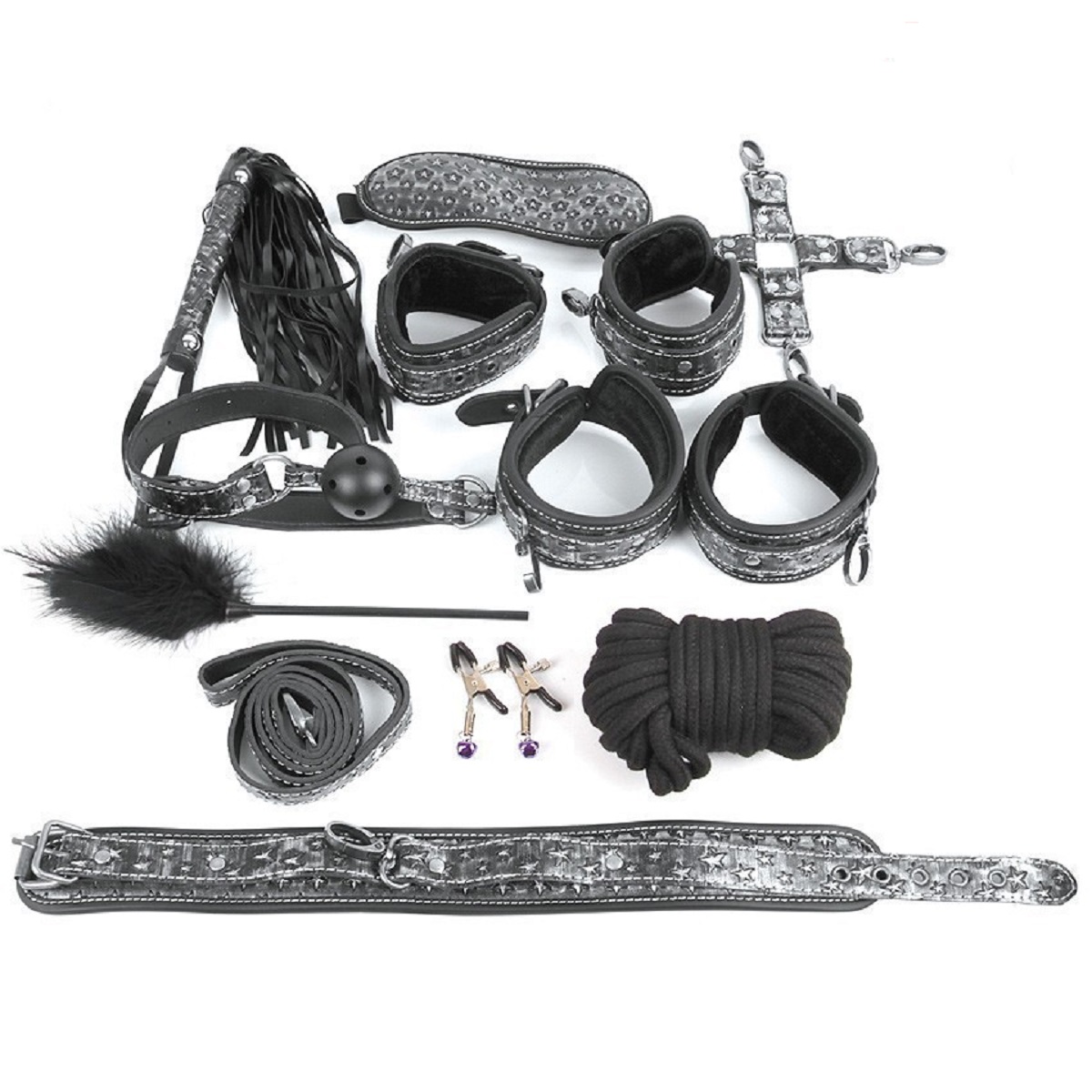 Великолепный набор аксессуаров для любителей БДСМ. В комплект входят наручники, оковы, ошейник с поводком, верёвка, фиксатор, плётка, кляп, маска, зажимы для сосков, щекоталка. Кляп, наручники, оковы, ошейник и маска снабжены специальной внутренней накладкой, предотвращающей натирание кожи. Также изделия имеют возможность регулирования размера. Плеть-флоггер состоит из хвостов и удобной рукоятки с петлёй. Зажимы для сосков имеют эластичные накладки, которые препятствуют сильному сдавливанию сосков. На каждом изделии предусмотрен регулировочный винт, позволяющий контролировать силу сдавливания сосков. Подвески дают небольшой эффект утяжеления и украшают зажимы. Удобный кляп оснащён шариком с отверстиями для дыхания. Щекоталка состоит из тонкой ручки и густого пушка. БДСМ-аксессуары выполнены в чёрно-серебристой цветовой гамме и украшены звёздами. После использования изделия рекомендуется обработать очищающим спреем с антимикробным эффектом ClearToy.