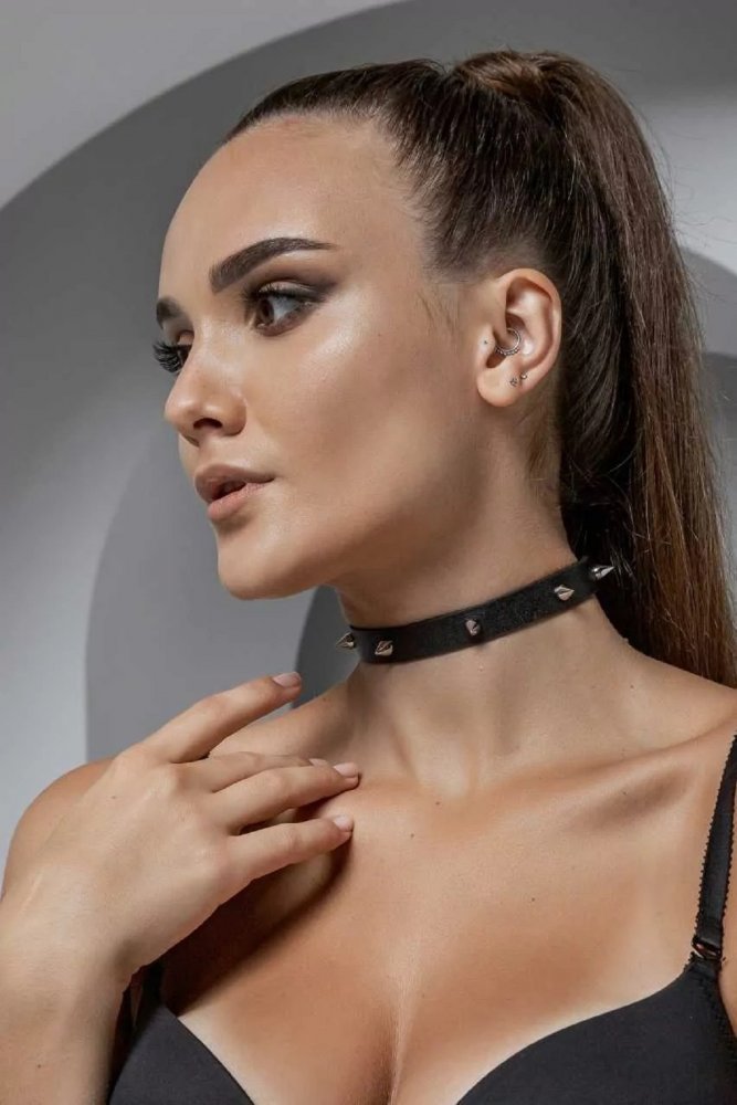 Чокер из натуральной кожи черного цвета украшенный семью шипами. Этот эротический аксессуар станет отличным подарком для взрослых. Застёгивается он при помощи надёжных стальных кнопок. Чокер отлично сидит на шее и подходит для интимных ролевых игр влюблённых пар. Размер: ширина чокера 1,4 см, длина 40 см. Чокер изготовлен из натуральной кожи. Цвет черный.
