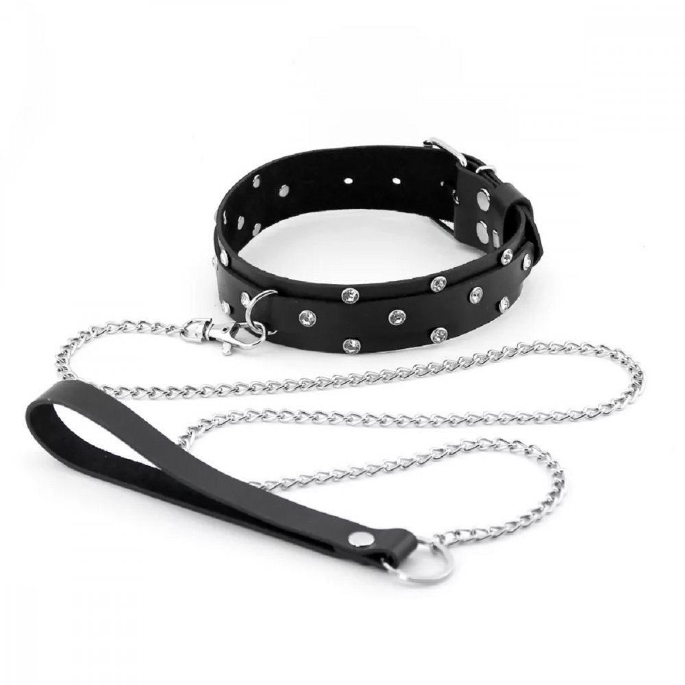 Ошейник БДСМ с поводком — это стильный и качественный аксессуар для любителей интимных ролевых игр. Кожа, из которой сделан ошейник, крепкая и не деформируется, но при этом она эластичная и приятная к телу. Ошейник украшен блестящими стразами по всей длине, а цепочка на поводке выполнена из надёжной стали. Размер можно регулировать от 29 до 38 см. Ошейник можно отстегнуть от цепочки и использовать отдельно. Он прост в применении и уходе. Несмотря на свою принадлежность к интимным аксессуарам, его можно без стеснения носить на вечеринке или фотосессии. Ошейник с металлическим поводком — отличное дополнение к сексуальному костюму. Он поможет вам освежить свою сексуальную жизнь и попробовать что-то новое и захватывающее. А качество натуральной кожи гарантирует нежность и комфорт при ношении, обеспечивая при этом безупречное ощущение удовольствия и подчинения. Размер: ширина ошейника 3 см, длина 42 см, длина поводка без темляка 54 см. Ошейник изготовлен из натуральной кожи. Цвет черный.
