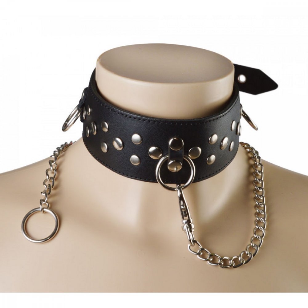 Чёрный ошейник из натуральной кожи, ширина которого составляет 4,5 см, имеет внутреннюю велюровую подкладку. Декоративным элементом данного аксессуара, является клёпки и три металлических кольца, удерживаемое кожаными накладками с клепками, кольца могут использоваться для присоединения поводка-цепочки к ошейнику. Длина поводка-цепочки с карабином 50 см. Фурнитутура имеет никелевое покрытие. Размер изделия регулируется металлической пряжкой.Размер: общая длина ошейника 50 см, ширина 4,5 см. Цвет черный.