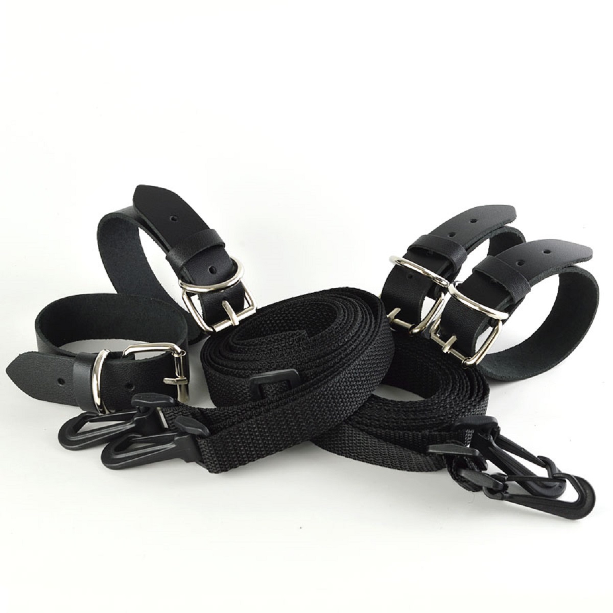 В комплект входят наручники, оковы и две растяжки на кровать. Длина каждого ремешка 2,7 м. Наручники и оковы из натуральной кожи крепятся к ремешкам при помощи прочных пластиковых карабинов. Цвет черный.