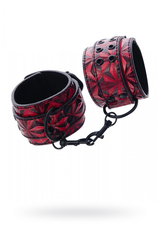 Оковы на ноги изготовлены из комбинированного материала, а именно искусственной кожи и винила, соединительная цепочка и дополнительные фиксирующие приспособления из металла. Главная сторона имеет яркую отделку узором, похожим на грани драгоценного камня, которые при поподании света переливаются, благодаря лаковому напылению. Ширина ручной манжеты 5,5 см, длина 26,5 см. Регулировочный ремень с застежкой имеет ширину 2,5 см и длину около 36,5 см. Длина цепочки между манжетами, включая карабин 17 см.