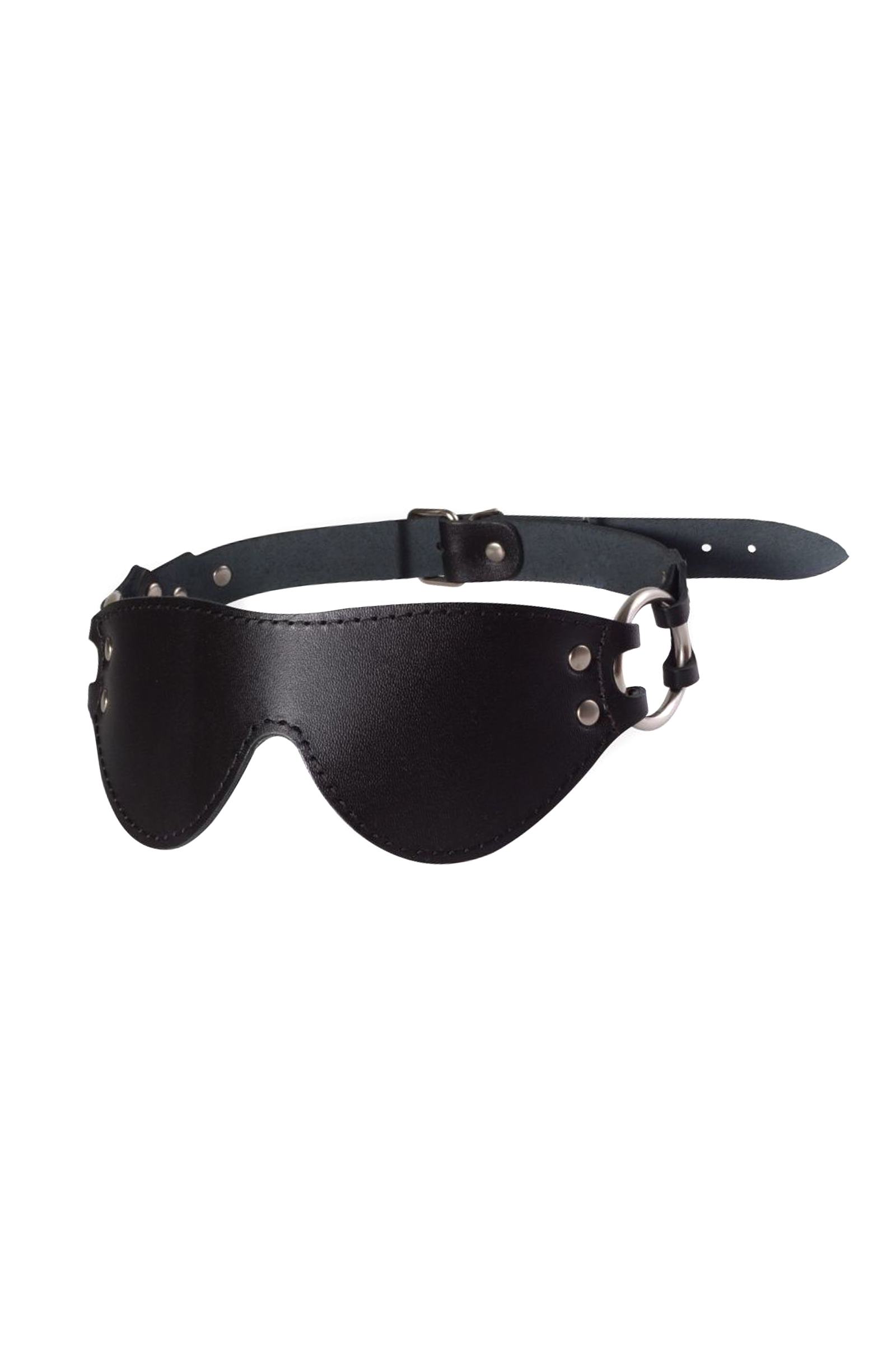 Изготовлена из натуральной кожи с велюровой подкладой. Украшена хромированными заклёпками и кольцами. Размер универсальный. Ремешок с пряжкой позволяет подогнать маску под любой размер. Цвет черный. Размер: длина самой маски 21 см, ширина 7 см.