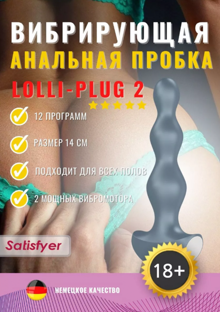Описание Побалуйте себя особенным удовольствием с анальной вибро елочкой Lolli-Plug 2 от Satisfyer. Гладкая и шелковистая игрушка имеет мягкое силиконовое покрытие. Коническая форма из трех сфер разного диаметра расширяется к основанию – это наслаждение от стимуляции и для новичков, и для опытных пользователей. Испытайте совершенно новые ощущения с Lolli-Plug 2, благодаря 2 мощным моторчикам, расположенным в основании и в середине игрушки. С помощью 12 разных режимов легко ощутить мягкие или интенсивные вибрации для чувственного анального массажа и стимуляции простаты. Анальная вибровтулка-унисекс подарит радость и мужчинам, и женщинам. Широкое основание игрушки обеспечивает безопасное использование и одновременно являясь держателем с кнопкой управления. Теперь можно полностью расслабиться и отдаться восхитительному процессу удовольствий. Защита от брызг и погружения расширяет возможности применения – хоть душ, хоть бассейн. размер: общая длина 14 см, рабочая длина 11 см, диаметр  2,6 см.